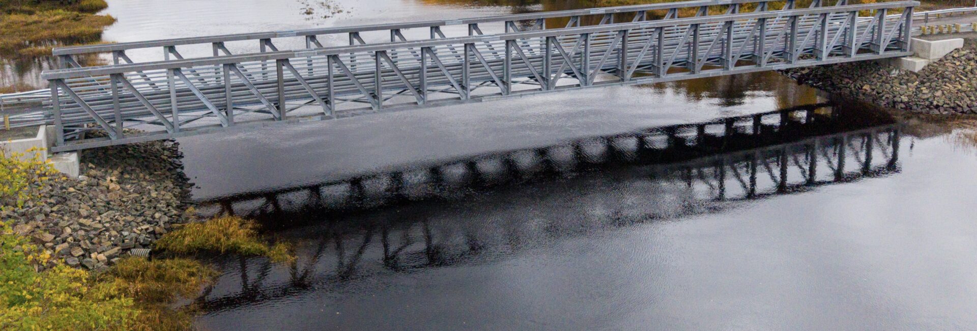 L’équipe des Ponts Algonquin a récemment conçu et livré un de nos ponts modulaires en treillis boulonné T1000 de forte capacité pour enjamber la rivière Sissiboo sur 64 mètres, près de Weymouth, en Nouvelle-Écosse. Le nouveau pont Gates Lane remplace un pont en treillis centenaire, qui avait été fermé en 2024.