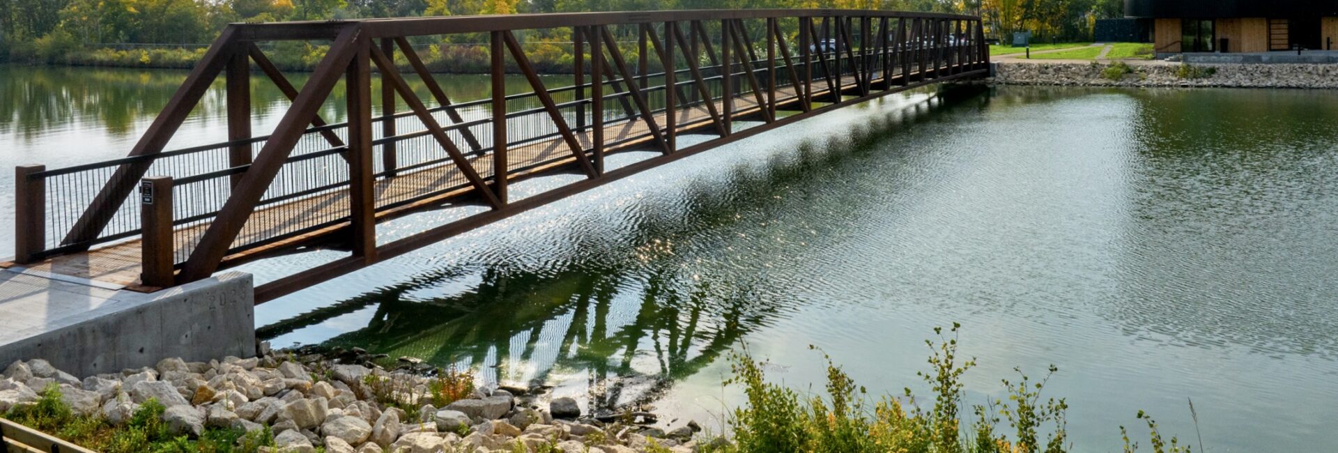 Quand on tient compte du fini en acier patinable de cette structure, de son tablier de bois et de sa fabrication alimentée à l’énergie solaire par une entreprise axée sur le développement durable qui vise la carboneutralité d’ici 2050, ce nouveau pont est un choix « naturel » pour cette organisation dont la mission est de rapprocher les humains de la nature.